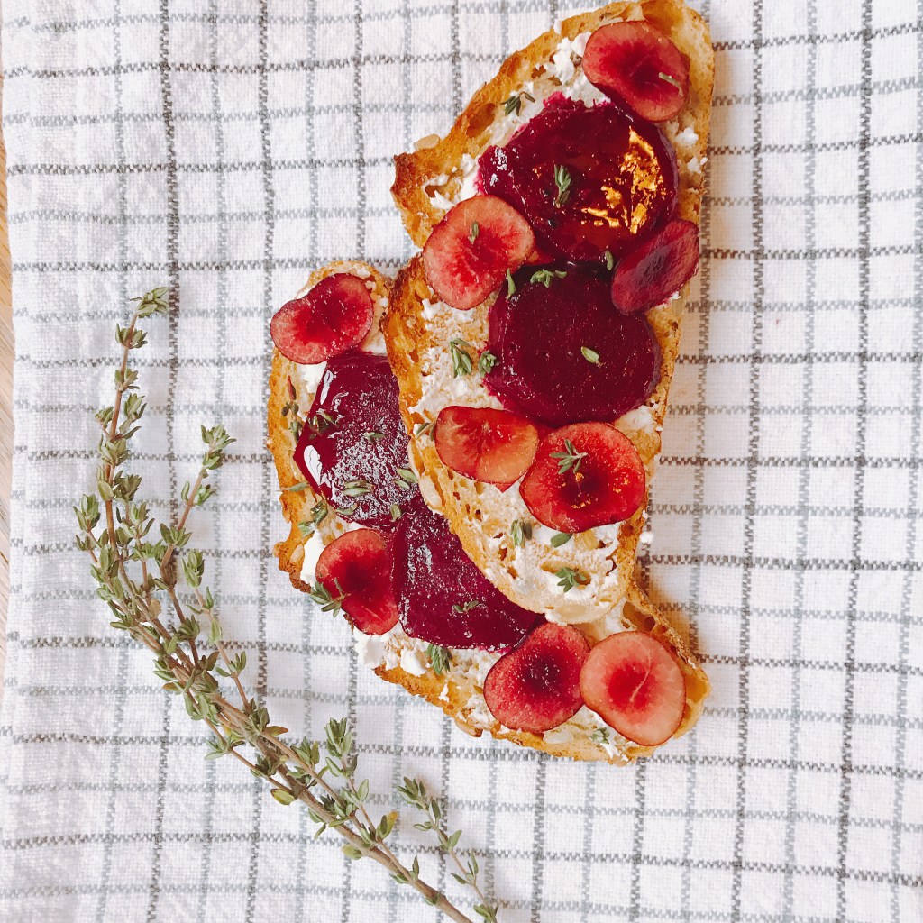 Spread goat cheese on toasted bread, add sliced beets and cherries, top with fresh thyme leaves. Goat cheese and beets are a grown up PB&J! They just compliment each other. Enjoy!