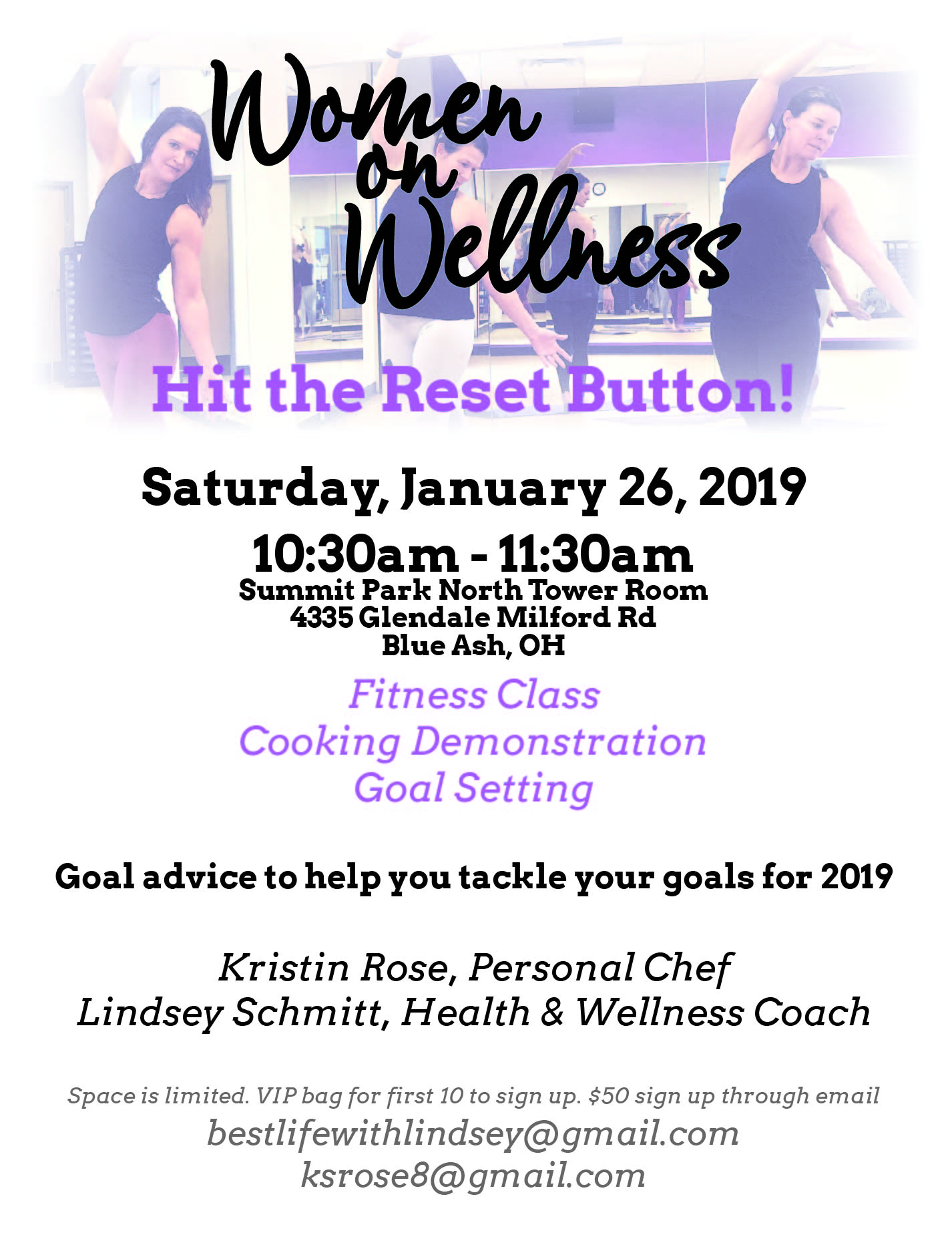 What happens when you get a Personal Chef and a Health and Wellness Coach together? Great Things! In the last year, my friend and favorite fitness instructor Lindsey started her own business as a Health and Wellness Coach. We have always talked about joining forces and this year we are doing just that with Women on Wellness. We are planning at least 3 events. This first events focus with be on hitting the Reset Button for 2019. If you are in the Greater Cincinnati area, then you are in luck.