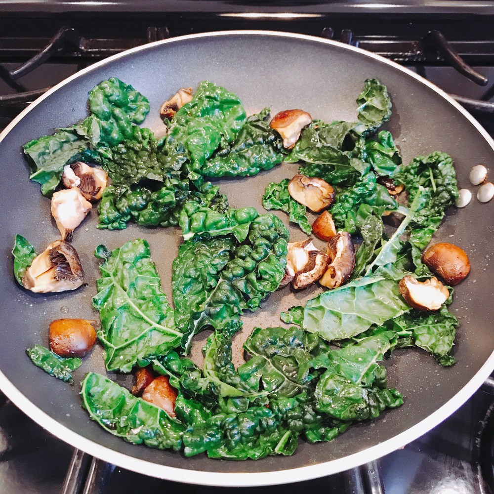 This is nothing new or earth shattering. A quick sauté of veggies on hand, add eggs and you have a quick healthy dish. I found myself running around wrapping up the week on a Friday and realized I hadn’t really eaten that day… not a fasting thing, which is planned but a oh my gosh I’m getting a headache! I had been really active that day and not listening to my body and I wanted to eat consciously. UHMMM I have kale, a few mushrooms… eggs, Ta -Dah! Midday meal solved. Reproduce this on the fly with what you have around and let me know your quick fix meals.