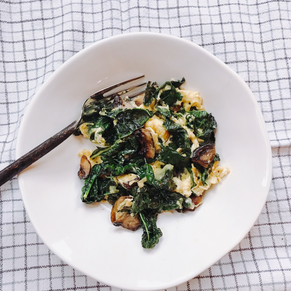 Heat a non stick pan with olive oil on medium heat.. Add kale and mushrooms and sauté until kale is crispy and mushrooms are softened. Add eggs to veggies and stir until all items are incorporated, season as you go. Finish with cheese if desired. Enjoy!