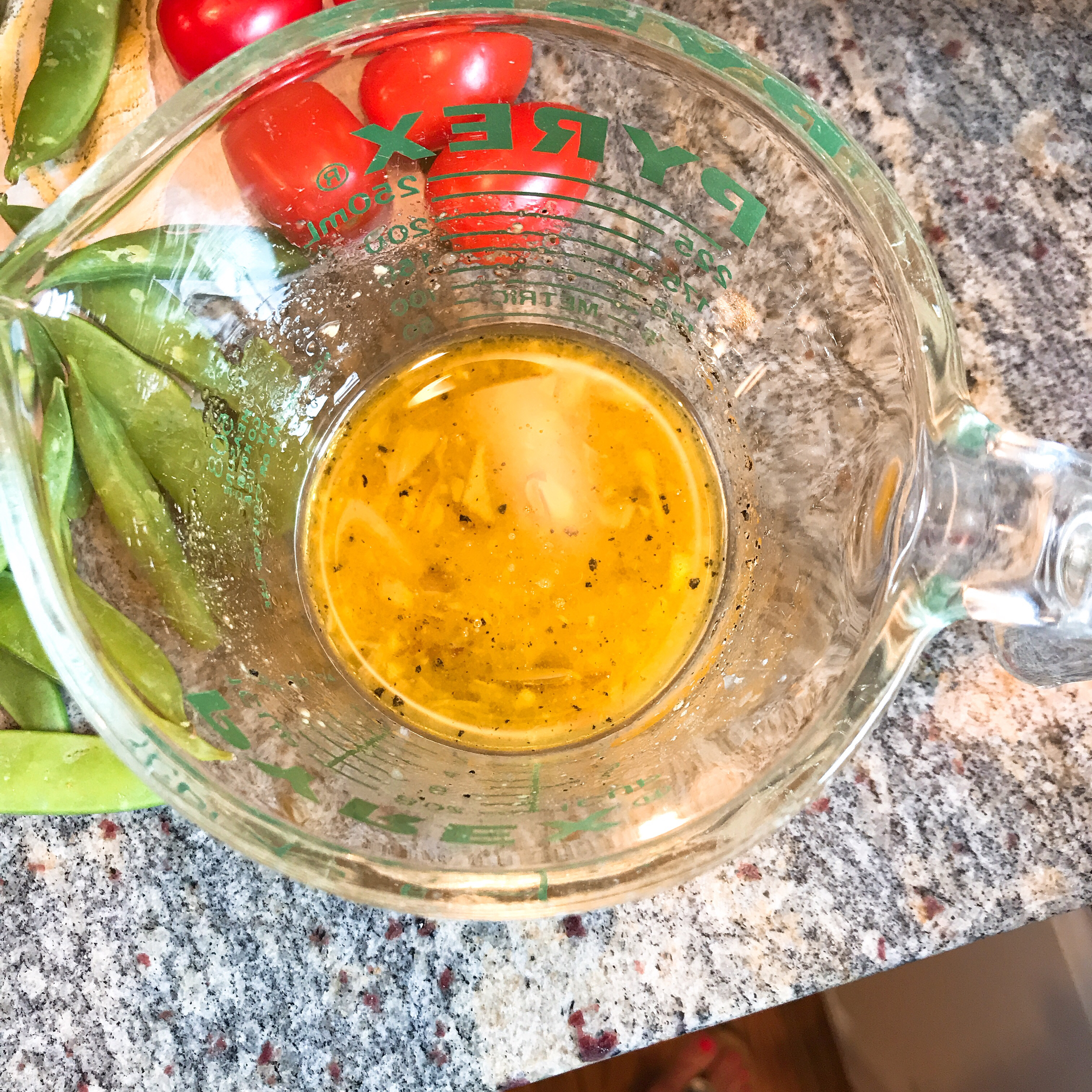 Gather the veggies you are using – adding green beans is a nice choice as well. Get a pot of water boiling, and a bowl of ice water ready for blanching. Once water is at a rolling boil, place asparagus and snap peas in the water, letting them blanche for a couple of minutes. When they turn bright green, place them in the ice water to shock them and hold their color. Take veggies out of the water and pat them dry. I like to cut the asparagus on the bias into bite size pieces. Place them in a bowl with the snap peas and tomatoes halves. Lightly salt and pepper. Pour 1/4 cup shallot vinaigrette over veggies and toss to coat well. Refrigerate until you want to serve. This can and should be made up to 1 day ahead as the flavor develops with age.