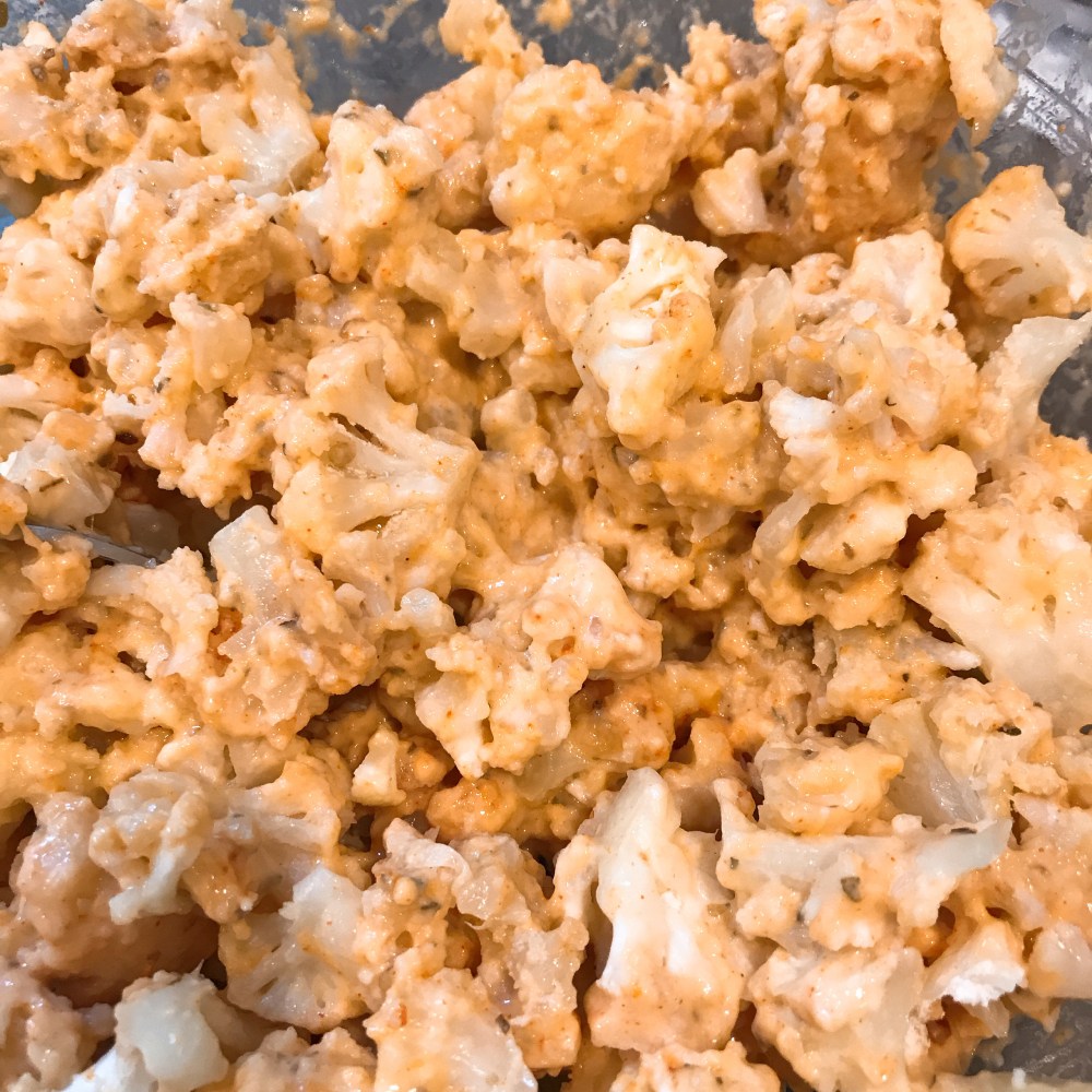 In a bowl, add cauliflower pieces, garlic , spices and flour. Mix to coat. Add beaten egg and coat all ingredients. The mix will be a little wet or dry. If dry you can add a tablespoon of water. This is the consistency you are looking for.
