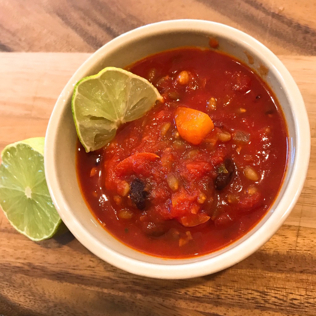This zesty wheat berry black bean chili is based on a recipe from Eating Well author Cheryl Sternman Rule. This one has some substitute ingredients and serves 4-6 and it can be doubled. Chipotles in adobo give it a smoky flavor and it’s balanced with a touch of coconut sugar while being full of fiber from the wheat berries and black beans. I was also fortunate to find a striped pepper and knew exactly how I wanted to use it in this recipe. You can use red or yellow peppers. Whatever you have around is fine. I buy my wheat berries online from Bob’s Red Mill. Sometimes they are hard to find at a conventional grocer. Make a batch and fill your freezer.