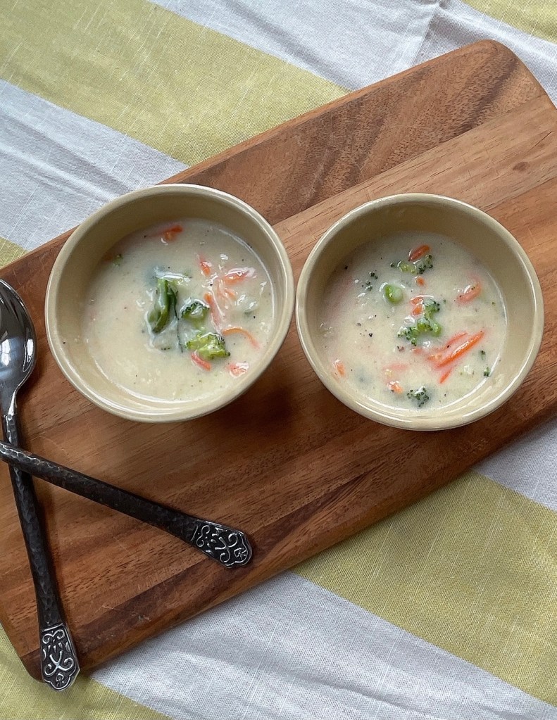 Cook for 1-2 minutes, add stock while slowly whisking, then add half and half. Add carrots and broccoli. Simmer on low for 15-20 minutes until vegetables are softened. Season with salt and pepper, stir in cheese, add nutmeg and check seasoning again.
