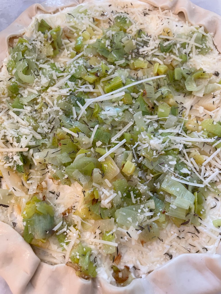 Heat a sauté pan, add olive oil or butter, sauté leeks until soft. Roll out tart, spread ricotta leaving a half-inch border around the edge. Add leeks, spread in an even layer, top with parmigiana and thyme. Salt and pepper to taste. Fold over edges. You can keep for 24 hours at this stage . When ready to bake, preheat oven to 350 degrees, brush edges with egg wash, sprinkle the edges with a little salt, and bake for 15 to 18 minutes. Serve warm with a nice salad.
