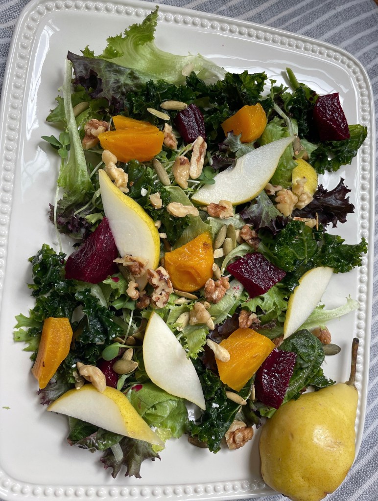 This is my riff on a salad I had this fall. It was full of greens, beets, golden and red, pears, pumpkin seeds and a pomegranate vinaigrette. I added walnuts and some kale. I used an apple cider vinaigrette in place of the pomegranate vinaigrette. A delicious addition would be adding bacon, feta or goat cheese.