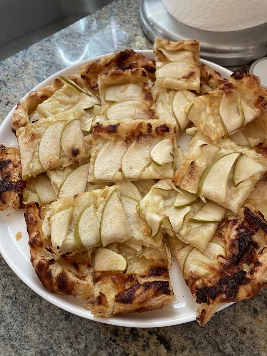 Preheat oven to 375 degrees. Thaw pastry (if it’s from the freezer). Place on a baking sheet. Doc center of pastry, leave 1/2 inch border for folding. Brush honey mustard sauce on center of pastry, reserve a little for the edges. This is a light coating to give a little flavor. ( 1 tablespoon each honey and dijon mustard, whisk together.) Cut apple with a mandolin, or as thin as you can with a knife. Even slices are what you want. Add shredded cheddar to the center area. Place apples in rows on top of cheddar/pastry. Any design you like, or just in rows will do the trick. Fold over edges, then brush edges with remaining sauce and place in the oven. Bake for 18-22 minutes until edges a lightly browned and crisp. Let cool slightly, cut into squares and serve.