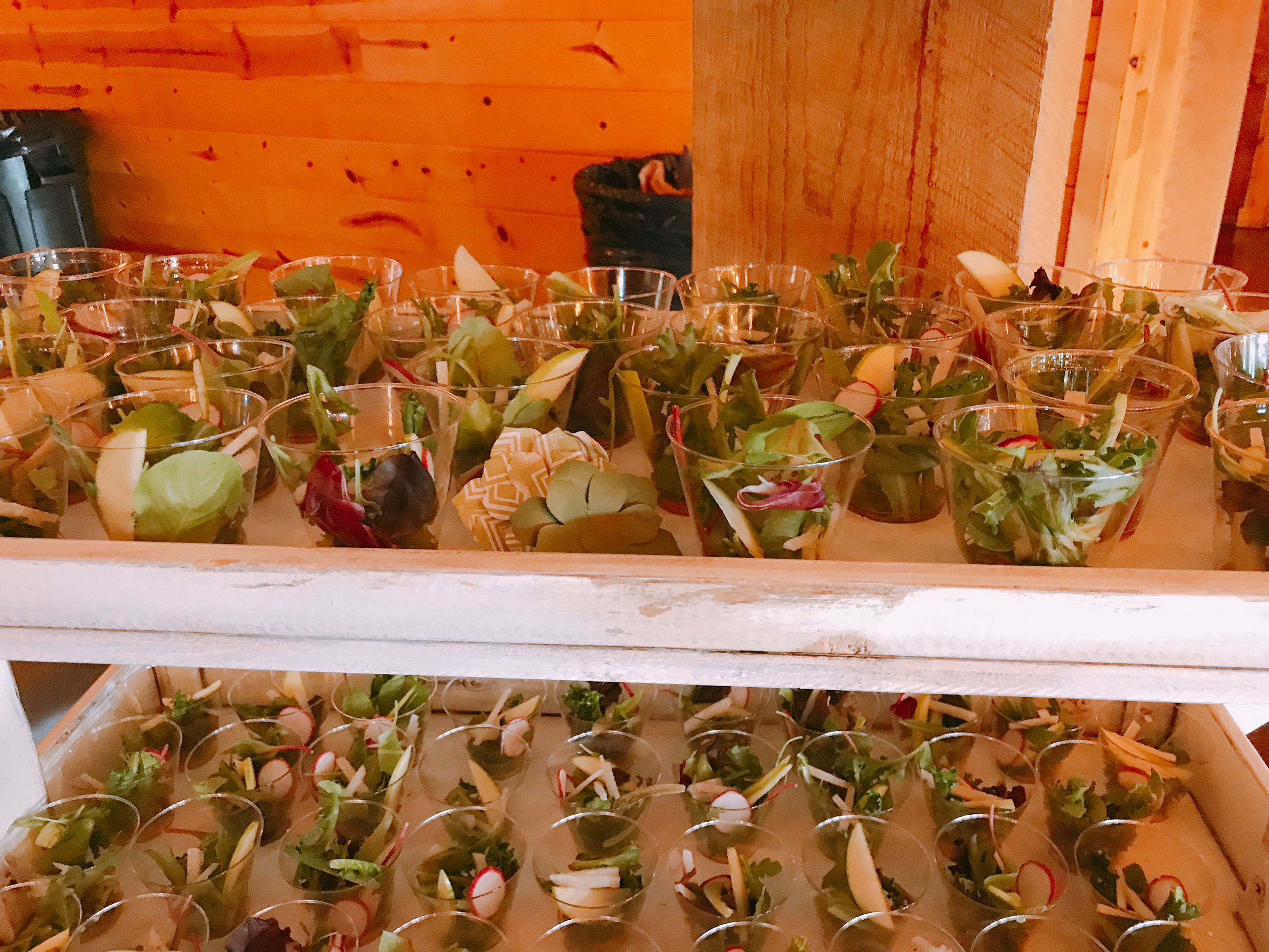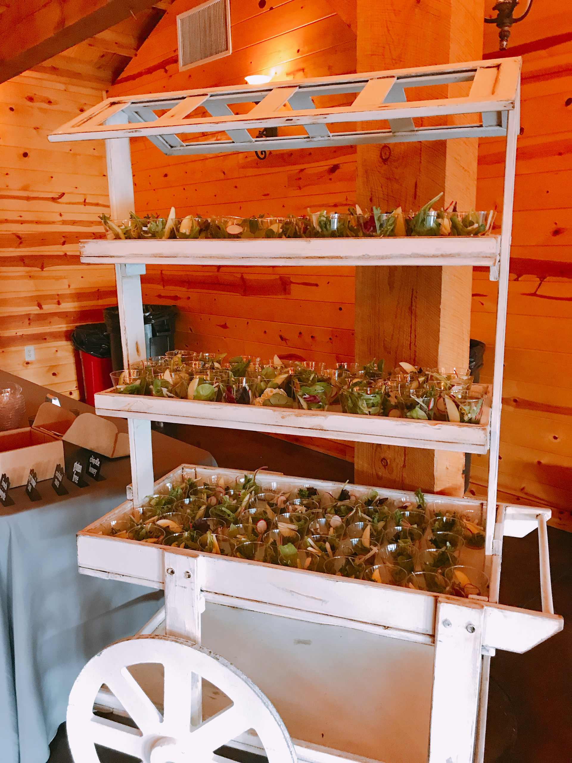That’s where I came into the mix. When we met back in April, I came up with a few ideas for salads. We decided on a mini salad that people could just pick up at the buffet. I like to think of them as grab & go salads. Mixed greens with radish, jicama, green apple and a choice of a chipotle dressing or a french vinaigrette. The grab & go salads turned out perfect and looked so great on this vintage cart that was provided by Cincinnati Rustic Rentals.